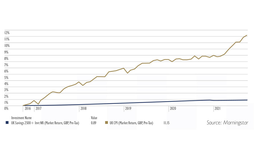 To demonstrate this, the chart to the right shows the rate of return which an individual would have received from the average UK bank savings account over the last 5 years up to 30/09/21 (as measured by the UK Savings £2,500+ Index), in comparison to the rate of UK inflation over the same period.